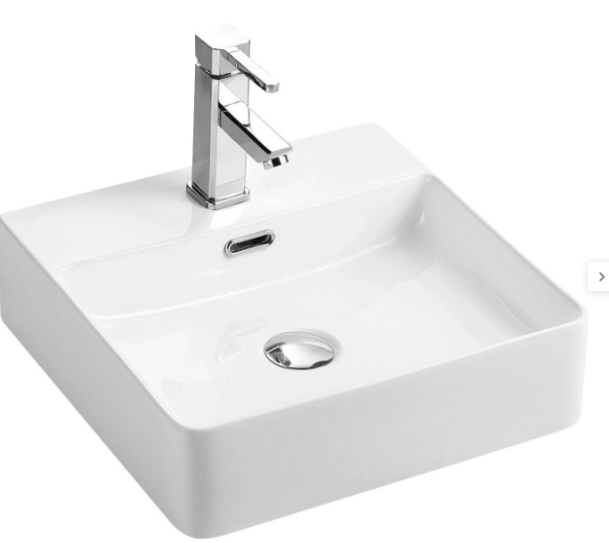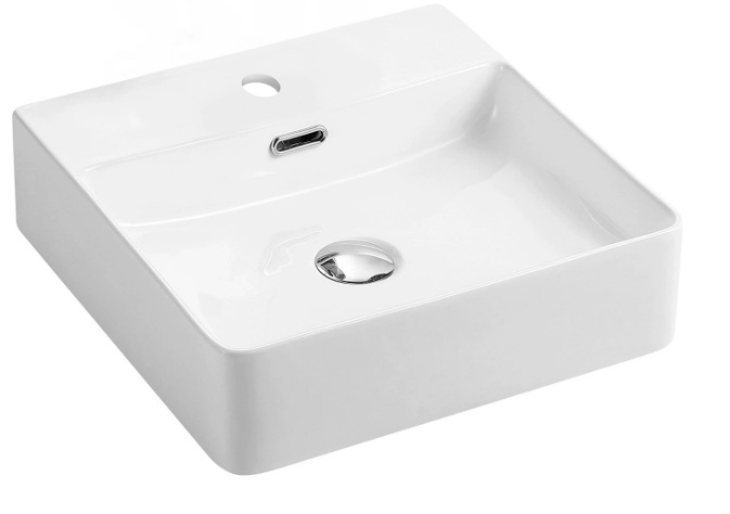 Lavabo de sobreponer cuadrado, de color blanco y medidas 42x42x12cm.