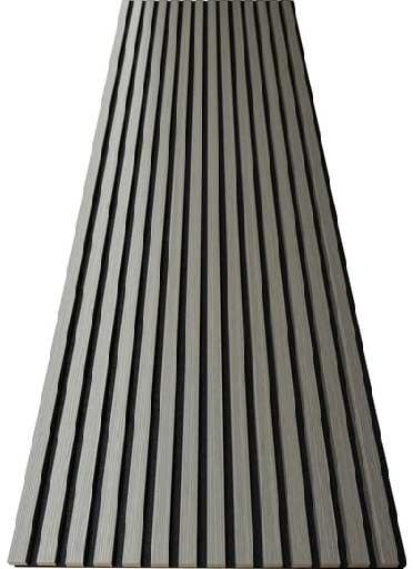 Revestimiento de listones melamina gris. Medidas 250 x 60 x 1.8 cm. con base de fieltro negro. Decoración por proceso personalizado de impresión digital.