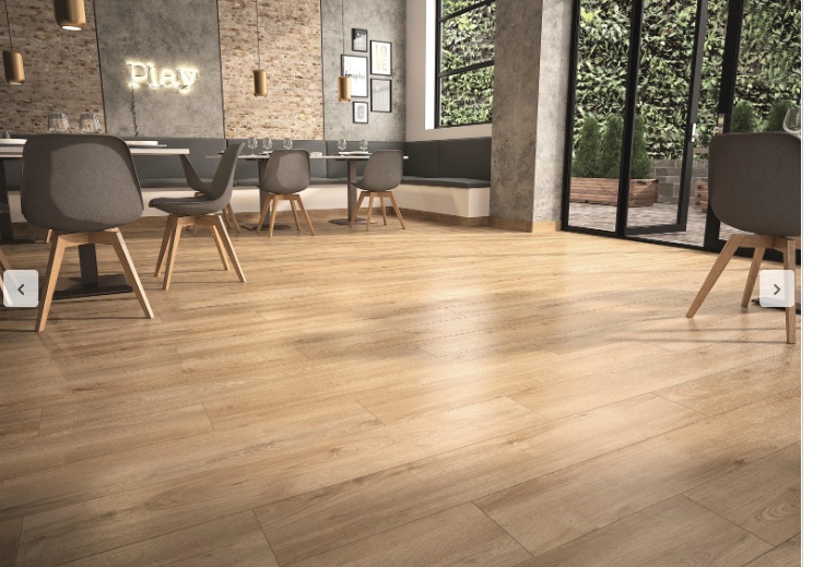 Suelo laminado AC5 10mm. Modelo Embero. Lama de 128,5×19,2cm. Acabado estructurado biselado. Instalación en clic. Paquete de 1,73m2. Se vende por paquetes.