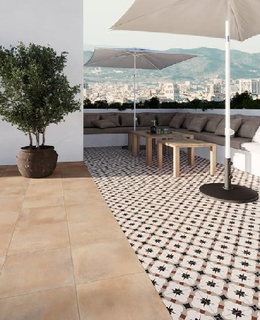 Baldosa porcelánico esmaltado serie Saona marca Gayafores. Estilo terracota. Color chiaro beige. Suelo exterior. Clase C3. Resistente a heladas. Superficie mate. Acabado estructurado. Formato 33,15 cm. x 33,15 cm.